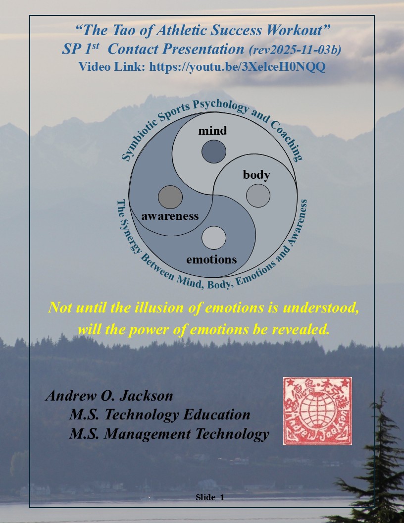 “The Tao of Athletic Success Workout” (immediately below) is a new sports performance psychology based on millions of years of evolutionary survival of the fittest, strongest, most agile and most powerful and clever and their evolved symbiotic harmony of mind, body, emotions, and awareness within a personal power of Qi. “The Tao of Athletic Success Workout” is a freely available self-directed 10-hour program with “Introduction” Videos for hours 1-5 available on YouTube. Hours 6-10 are an instructional, fill-in-the-blank “Exploration” text that further develops an athlete’s skills, abilities, and understandings of their “Quantum Being” nature beyond their Newtonian linear time and 3D spacial awareness, strengths, and power.
